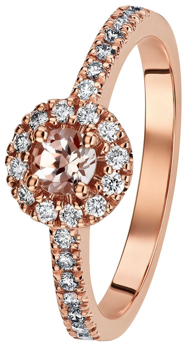 Kohinoor 033-264P-26MO Valerie timanttisormuksessa on pyöreä muotoilu, johon on istutettu huimat 26 timanttia! Sormuksessa on halo- ja rivi-istutus, jonka keskellä on vaaleanpunainen morganiitti-kivi. Sormus on valmistettu 14 karaatin punakullasta. Suunnittelu Sami Laatikainen.