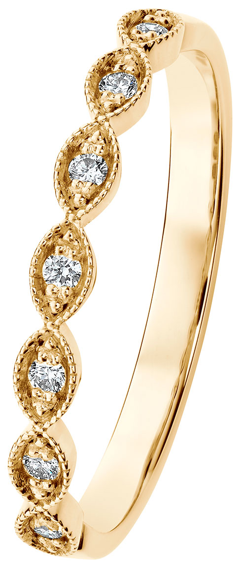 Kohinoor 033-269-07 Clara timanttisormus on valmistettu 14 karaatin keltakullasta. Vintage-henkiseen rivisormukseen on istutettu 7 timanttia ja sormuksen reunat on koristeltu krysanttireunoin. Suunnittelu Sami Laatikainen.