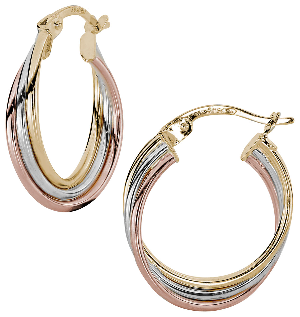 Kohinoor kolmiväriset putkirenkaat 133-8442 ovat 14k kelta-, valko- ja punakullasta valmistetut korvakorut, joiden häikäisevä väriyhdistelmä ja muotoilu sopii erinomaisesti jokapäiväiseksi korvakoruksi. Korvarenkaiden halkaisija 14,5 mm. Koko 3,6 x 1,4 mm. Korvarenkaissa on saranakiinnitys. Suomalaiset Kohinoor sormukset toimitetaan valmistajan alkuperäisessä rasiassa.