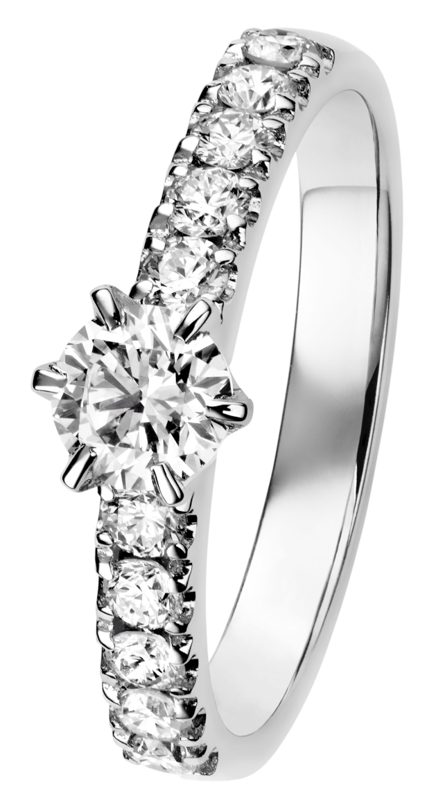 Kohinoor Leonora valkokultainen timanttisormus 934-248V-85B3 on kaunis 18-karaatin valkokullasta valmistettu sivukivellinen sormus. Sormuksessa on kruunu-istutettu keskikivi ja sivukivet ovat uraistutettu. Timantit ovat painoltaan yhteensä 0,85 karaatia (0,45 + 10 x 0,04). Timantit ovat briljanttihiottuja ja puhtausluokitukseltaan VS. Sormuksen leveys on 2,7 mm ja kiven kohdalta