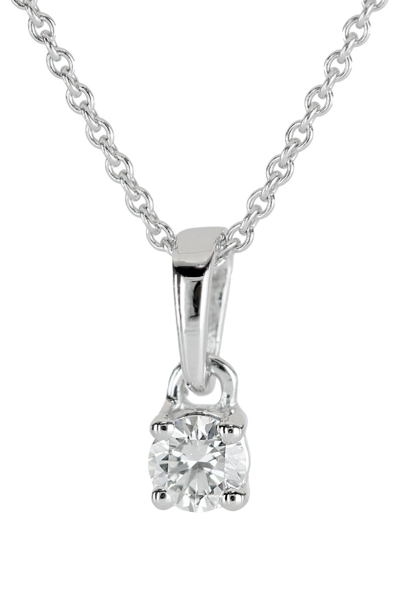 Elegantti Kohinoor Timanttiriipus + ketju 123-9850V on koristeltu yhdellä 0,07 ct. H SI timantilla, jota reunustaa neljän kynnen kruunuistutus. Kaunis riipus on täydellinen lisä mihin tahansa asuun tai muiden korujen rinnalle. Tämän yksikivisen timanttikaulakorun ketjun pituus on säädettävissä välille 42-45 cm, ja riipuksen koko on 2,8 mm x 7,8 mm. Timanttikaulakoru on valmistettu 14-karaatin valkokullasta.