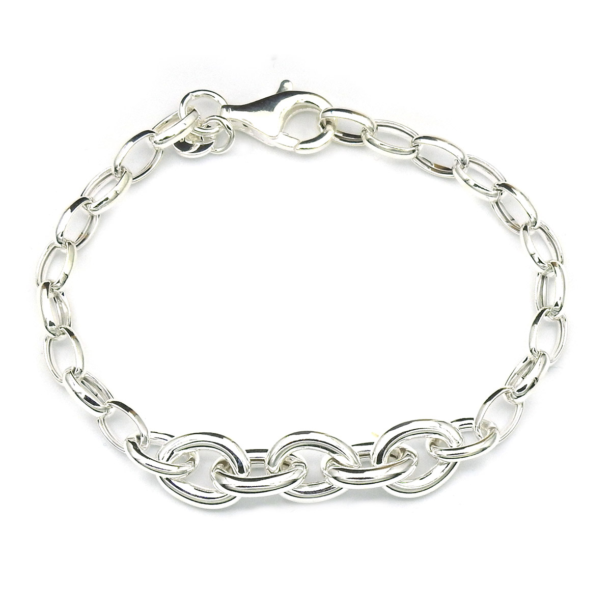 Tämä ovaaleista lenkeistä koostuva rannekoru levenee näyttävästi keskeltä. Ranneketju on pituudeltaan 19 cm ja leveimpien lenkkien kohdalta leveys on 9,5 mm. Rannekorussa on näyttävä, iso papukaijalukko. Koru on valmistettu hopeasta.