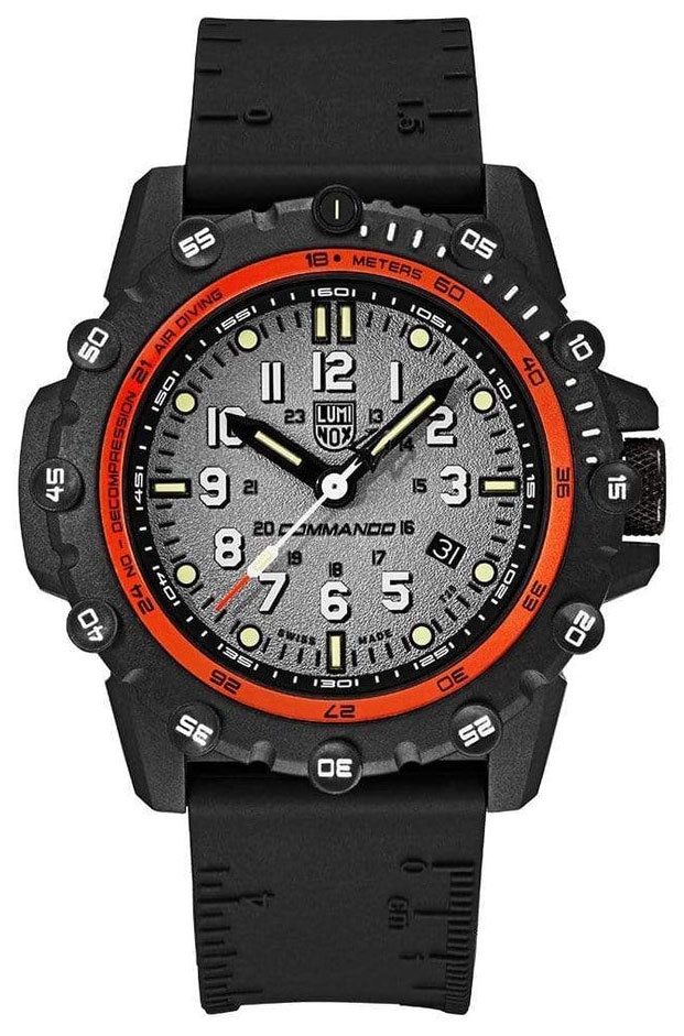 Luminox Commando Frogman 3301 ilahduttaa sukeltajia sekä ulkoilufaneja, sillä vankan rakenteensa ansiosta se kestää lähes mitä tahansa. RONDA 715 LI -liikkeellä varustetussa Commando Frogmanissa on yksisuuntaisesti pyörivä "Dive Time" -kehys, joka on tämän mallin erikoisominaisuus. Se ei ainoastaan osoita, kuinka kauan voit olla veden alla vaan myös näyttää dekompressio-asteikon, jonka avulla voit laskea, kuinka kauan voit sukeltaa milläkin syvyydellä. Kello on varustettu kestävällä CARBONOX-rungolla, joka on 46 mm leveä ja 14 mm paksu. Naarmuuntumaton ja heijastamaton safiirilasi suojaa kellotaulua, joka hyödyntää Super-LumiNova jälkihehkua sekä Luminox Light Technologya, taaten erinomaisen luettavuuden kaikissa valaistusolosuhteissa ja sääolosuhteista riippumatta jopa 25 vuoden ajan. Kelloon kiinnittyy taipuisa musta kumiranneke, jonka leveys kiinnityskohdasta on 24 mm. Kellon kokonaispaino on 85 grammaa ja se kuuluu vesitiiviysluokkaan 200m / 20atm, joten se on erikoisvesitiivis ja soveltuu laitesukellukseen.