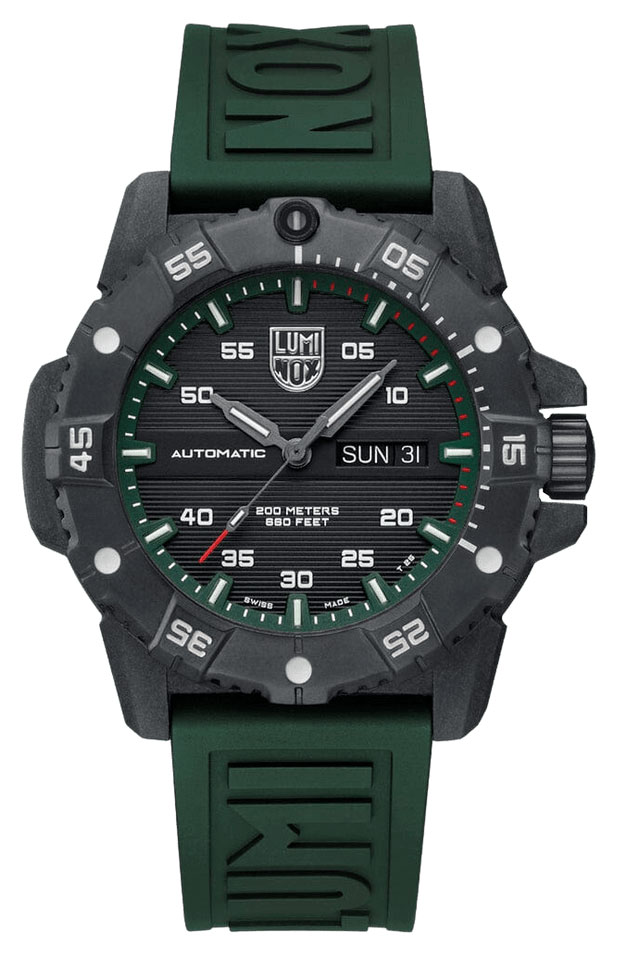 Luminox Master Carbon Seal Automatic 3877 yhdistää kaikki yksityiskohdat, joista Luminox on kuuluisa - kestävyys, valoisuus, vedenkestävyys, luettavuus - automaattiseen SELLITA SW 220-1 liikkeeseen, jossa on myös päivä- ja päivämääräikkuna. 45 mm leveä ja 14 mm paksu runko on valmistettu CARBONOX+ materiaalista, joka on kevyt, kestävä, hypoallergeeninen, säänkestävä, iskunkestävä ja naarmuuntumaton. Naarmuuntumaton ja heijastamaton safiirilasi suojaa kellotaulua, joka hyödyntää Luminox Light Technologya, taaten erinomaisen luettavuuden kaikissa valaistusolosuhteissa ja sääolosuhteista riippumatta jopa 25 vuoden ajan. Kelloon kiinnittyy taipuisa vihreä kumiranneke, jonka leveys kiinnityskohdasta on 24 mm. Kellon kokonaispaino on 110 grammaa ja se kuuluu vesitiiviysluokkaan 200m / 20atm, joten se on erikoisvesitiivis ja soveltuu laitesukellukseen.