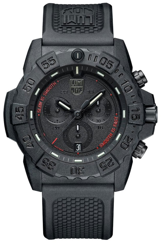 Luminox Navy SEAL Chronograph 3581.SIS kellotauluun on kaiverrettu punaisella kuuluisa SEAL-mantra "Slow is Smooth, Smooth is Fast", joka muistuttaa sinua tästä käsitteestä aina, kun katsot kelloasi. 3581-malliston kello on luotu selviämään kaikenlaisista haasteista maastossa, niin maalla, merellä sekä äärimmäisissä olosuhteissa. Kello on varustettu kestävällä CARBONOX-rungolla, joka on 45 mm leveä ja 15 mm paksu. Karkaistu mineraalilasi suojaa mustaa kellotaulua, jossa on kolme alataulua kronografitoiminnoille ja joka hyödyntää Luminox Light Technologya, taaten erinomaisen luettavuuden kaikissa valaistusolosuhteissa ja sääolosuhteista riippumatta jopa 25 vuoden ajan. Kelloon kiinnittyy taipuisa kumiranneke, jonka leveys kiinnityskohdasta on 24 mm. Sveitsiläisen RONDA 5030.D kvartsiliikkeen ansiosta tämä kello on paitsi toimiva jokapäiväiseen käyttöön, mutta myös luotettava kumppani missä tahansa ympäristössä. Kellon kokonaispaino on 80 grammaa ja se kuuluu vesitiiviysluokkaan 200m / 20atm, joten se on erikoisvesitiivis ja soveltuu laitesukellukseen.