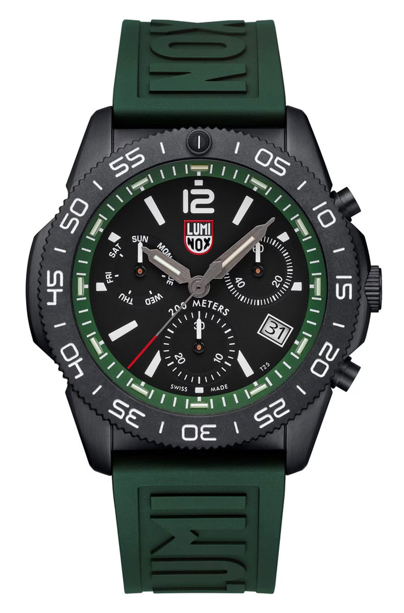 Luminox Pacific Diver Chronograph 3147 on moderni tulkinta klassisesta sukeltajankellosta, jossa yhdistyvät sveitsiläinen tarkkuus, ajanotto ominaisuudet ja tinkimätön kestävyys. Tämä uutuus kronografimalli on suunniteltu niille, jotka vaativat kelloltaan yhtä paljon niin meren syvyyksissä kuin kaupungin sykkeessä. Tummanpuhuva musta teräskuori yhdistettynä syvänvihreään kumirannekkeeseen luo näyttävän ja urheilullisen kokonaisuuden, joka ei jää huomaamatta.