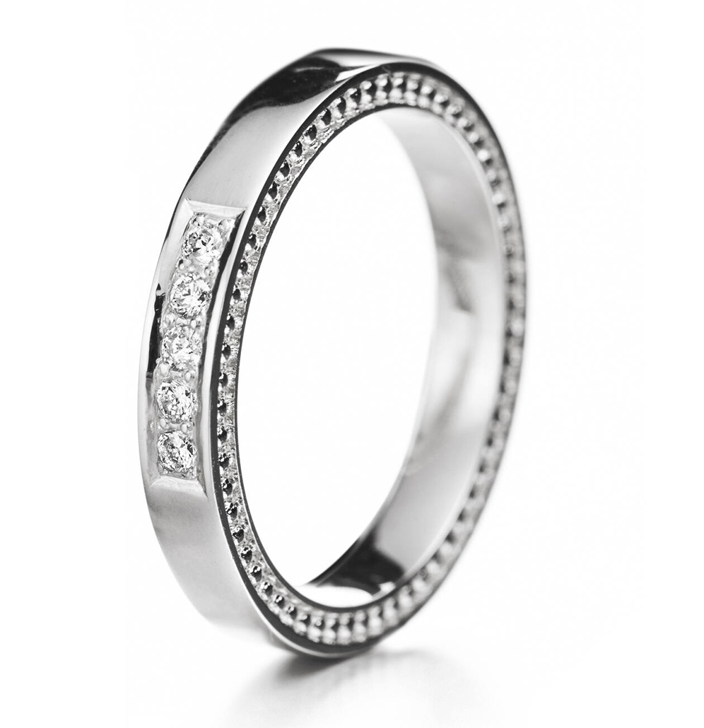 Lumoava Tahdon -timanttisormus on tyylikäs monikivinen sormus. 14k valkokullasta valmistetussa laboratoriotimanttisormuksessa on viisi 0,02 ct timanttia. Timanttien yhteispaino on 0,10 ct ja sormuksen leveys on 3 mm. Sormus on valmistettu käsityönä Kuopiossa 100% kierrätetystä materiaalista. Vihkisormuksen muotoilijana on toiminut Heikki Hartikainen.