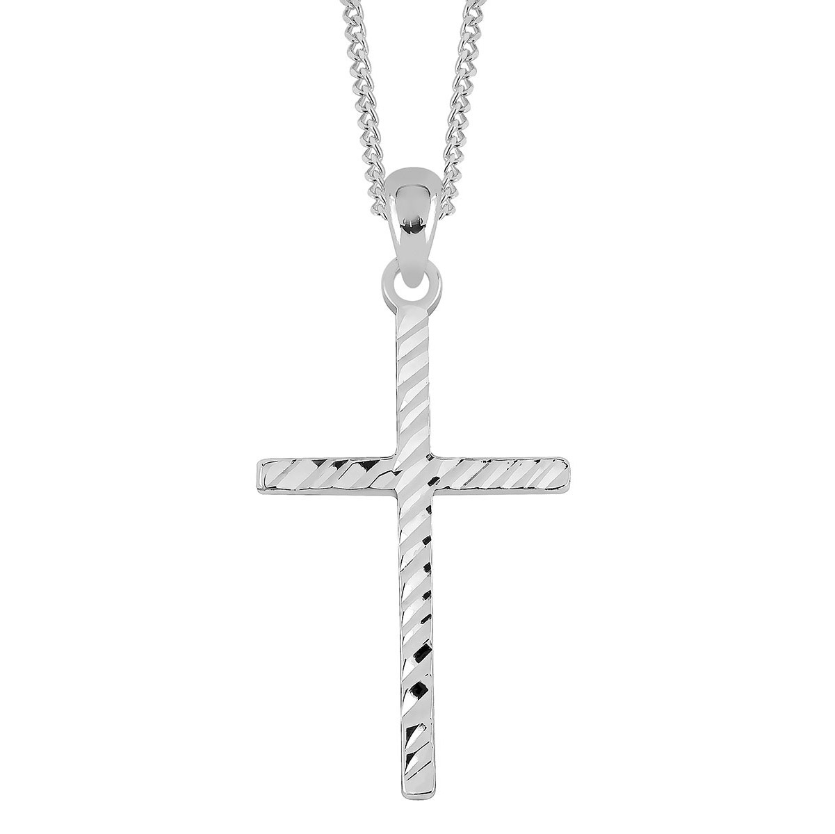 Riipuksen koko on 25,6 x 14,40 mm, mikä tekee korusta näyttävän mutta ajattoman. Materiaalina on rodinoitu hopea, joka antaa korulle kirkkaan, peilimäisen kiillon ja suojaa pintaa tummumiselta. Viistehiottu kuviointi tuo ristiin elävyyttä ja viimeisteltyä ilmettä.