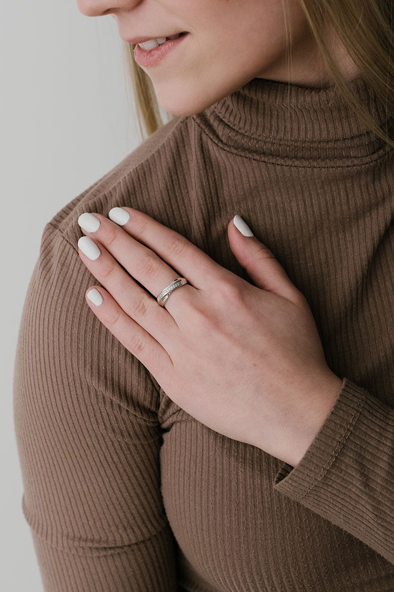 Lykka Casuals hopeasormuksessa on elegantti kiertyvä malli, jonka diagonaalinen usean synteettisen zirkonian istutus antaa sormukselle elävyyttä. Runko on sterling-hopeaa, ja kokonaisuuden viimeistelee rodinointi, joka antaa sormukselle ajattoman kiillon ja estää hopeaa tummumasta. Rungon leveys 1,3 mm, leveys istutuksen kohdalta 6 mm. Lykka-korut toimitetaan kauniissa rasiassa.