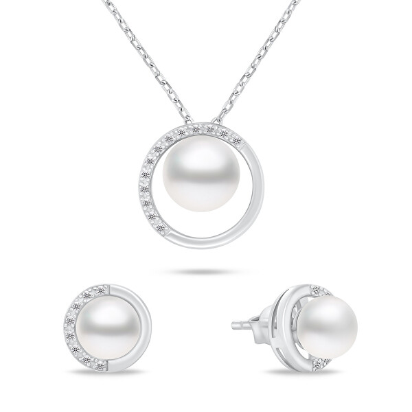 Kaulakorussa on 42 cm pitkä ketju ja 3 cm jatkopala, joten sen pituutta voi säätää omaan tyyliin sopivaksi. Riipuksen halkaisija on 15 mm ja siinä yhdistyvät kiiltävä helmi sekä hienostuneet zirkoniat kehällä. Korvakorujen koko on 10 mm, ja ne täydentävät täydellisesti kaulakorun ilmeen.