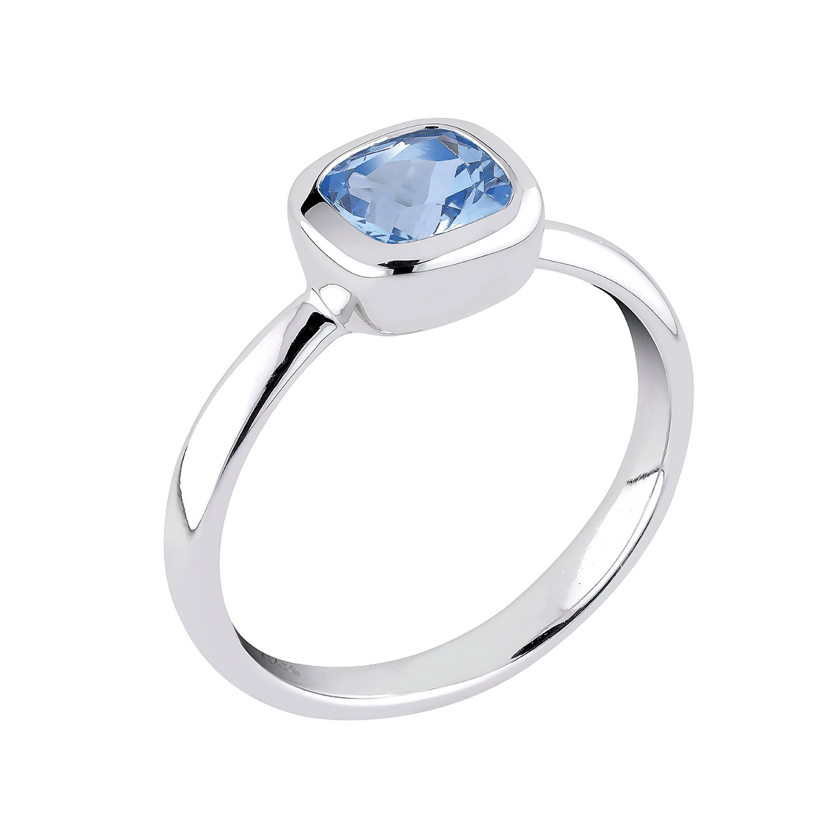 Sormuksen kruununa on kaunis, neliönmuotoinen sininen topaasi, joka on aseteltu tukevasti 2,55 mm leveään istutukseen. Kiven heleän sininen sävy tuo mieleen puhtaan kesätaivaan ja antaa korulle hienostuneen ilmeen. Sormuksen runko on siro, vain 1,3 mm kapea, mikä tekee siitä erittäin mukavan kantaa ja täydellisen valinnan niin yksin käytettäväksi kuin yhdisteltäväksi muiden sormusten rinnalle.