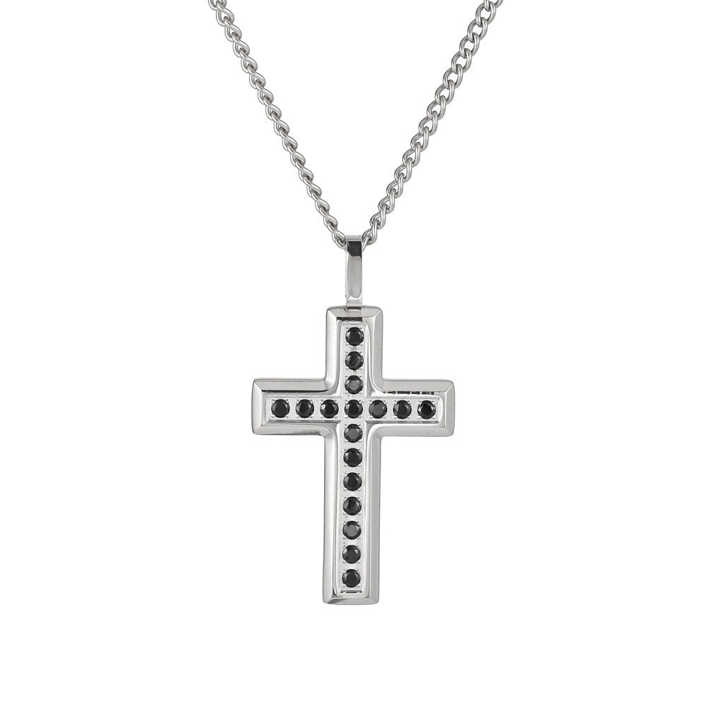 Lykken Strong -kaulakoru yhdistää klassisen ristin muodon moderniin viimeistelyyn. Kiiltävä teräksinen ristiriipus on koristeltu mustilla korukivillä, jotka tuovat koruun syvyyttä ja hienostunutta kontrastia. Kaulakoru on valmistettu kestävästä ruostumattomasta teräksestä ja mustat kivet korostavat ristin muotoa ja tekevät riipuksesta tyylikkään katseenvangitsijan. Ristiriipuksen koko: 34 x 23 x 3 mm.