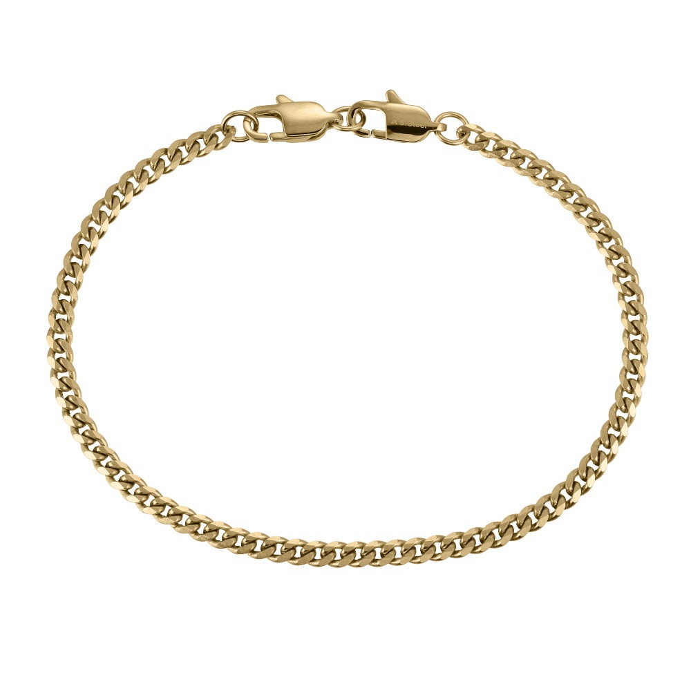 Rannekoru on valmistettu 14 karaatin kullatusta ruostumattomasta teräksestä, joka tunnetaan kestävyydestään ja miellyttävästä käyttötuntumastaan. Kullanvärinen teräspinta antaa korulle modernin ilmeen ja tukeva papukaijalukko pitää korun turvallisesti paikoillaan. Koko: 21 x 0,35 cm.