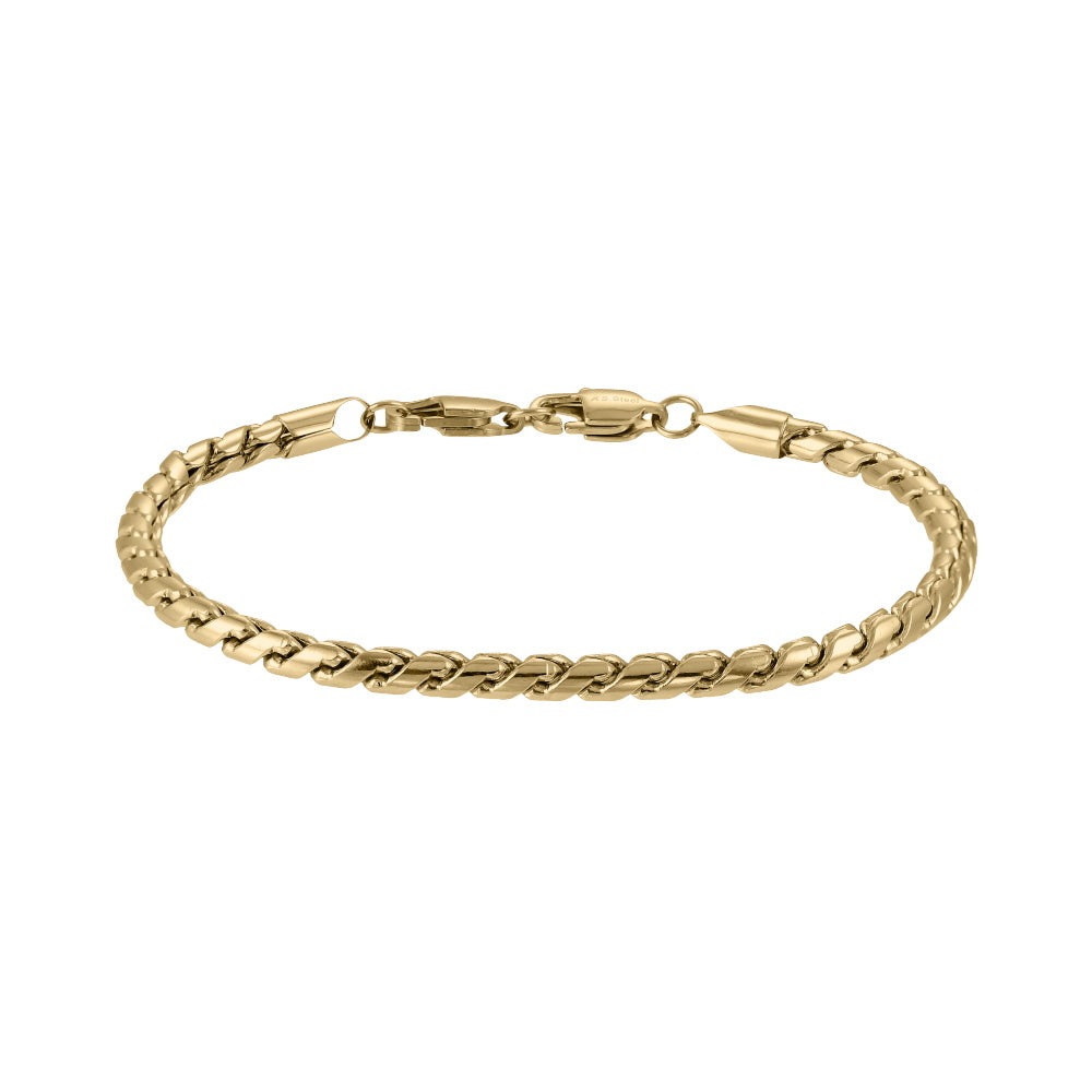 Rannekoru on valmistettu 14 karaatin kultapinnoitetusta ruostumattomasta teräksestä, jonka kullanvärinen pinta antaa korulle viimeistellyn ulkonäön. Tukeva lukko varmistaa miellyttävän ja turvallisen käytön. Koko: 21 x 0,4 cm.