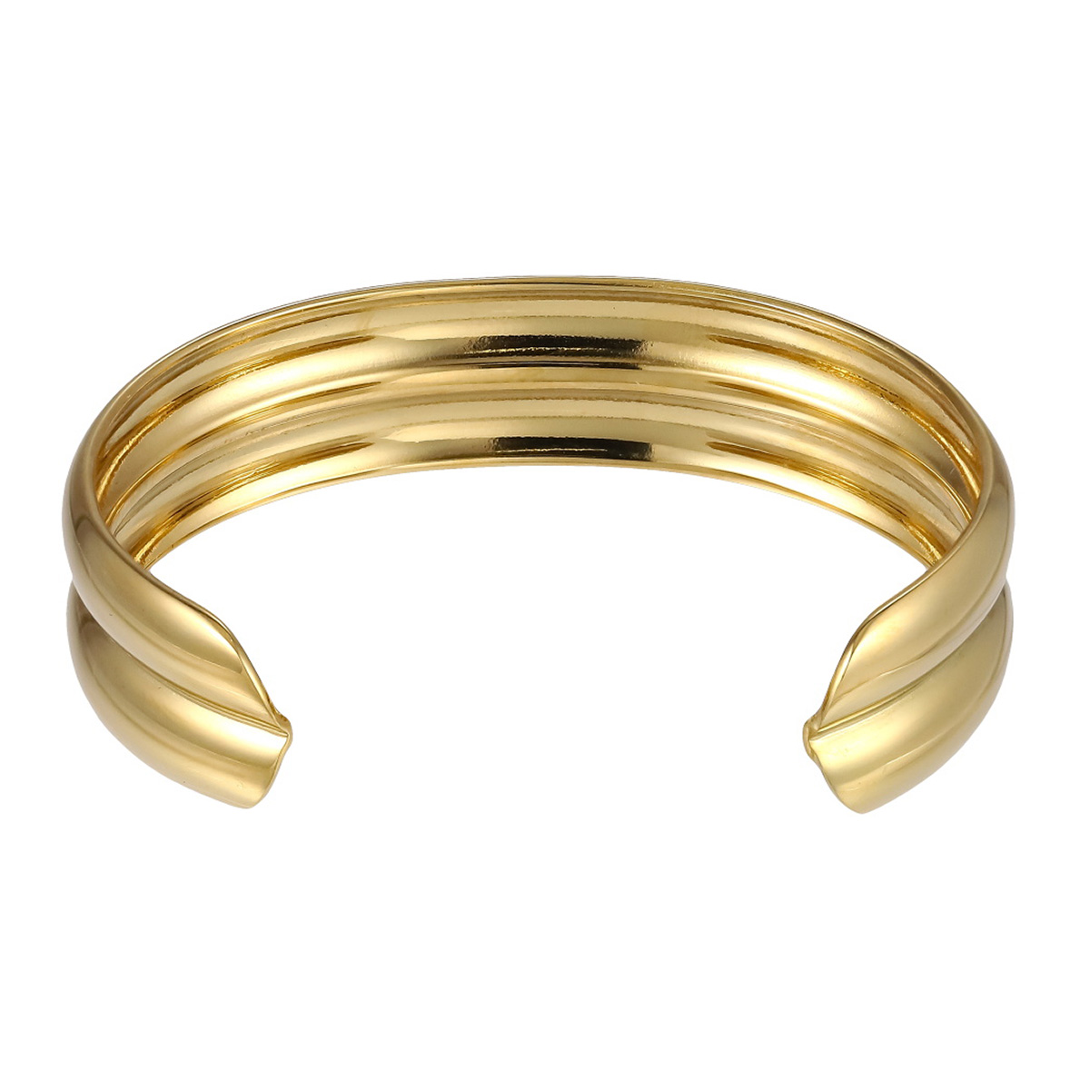 Rannekorun kaksoisrunkoinen muotoilu luo näyttävän illuusion useammasta päällekkäisestä korusta. Se on valmistettu korkealaatuisesta ruostumattomasta teräksestä, joka on viimeistelty ylellisellä ja kestävällä 14k kultauksella. Rannekorun avoin muoto tekee siitä helpon pukea ja antaa pienen säätövaran istuvuuteen; se asettuu kauniisti ranteeseen ja pysyy paikoillaan. Koko: 60 x 16,5 x 1,1.