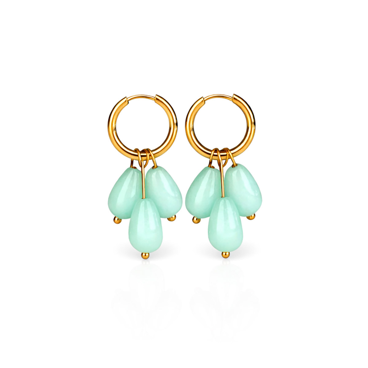 Korujen kultainen rengas (ulkohalkaisija 16 mm, paksuus 2 mm) on valmistettu korkealaatuisesta ruostumattomasta teräksestä ja viimeistelty kestävällä 18K PVD-kultauksella, joka takaa kiillon ja värin säilymisen pitkään. Hypoallergeeninen materiaali tekee koruista miellyttävät ja turvalliset käyttää myös herkälle iholle. Jokainen luonnonkivi (koko noin 8 × 12 mm) on ainutlaatuinen, joten jokainen korupari on yksilöllinen ja erityinen.