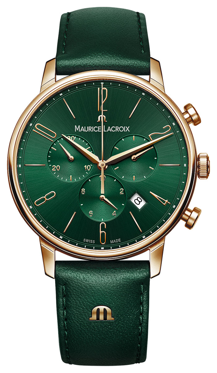 Maurice Lacroix Eliros Chronograph EL1098-PVP01-620-5 on tyylikäs miesten kello, jonka 40 mm leveä kullanvärinen runko on valmistettu ruostumattomasta teräksestä. Runkoon kiinnittyy vihreä nahkaranneke. Safiirilasin alla suojassa on vihreä kellotaulu, jossa ajanotto-ominaisuudet ja päivyri. Maurice Lacroix EL1098-PVP01-620-5 kuuluu vesitiiviysluokkaan 50m / 5atm eli se on rajoitetusti vesitiivis (uintia ei suositella). Maurice Lacroix -kelloille myönnetään kahden vuoden takuu ja ne toimitetaan valmistajan alkuperäisessä pakkauksessa.