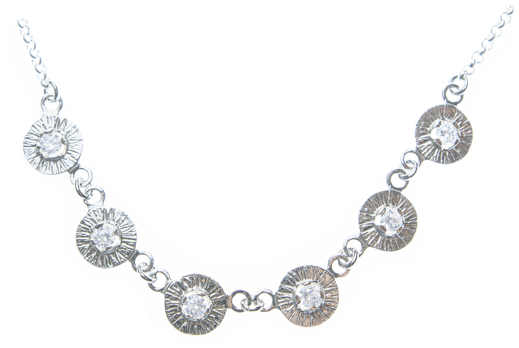 Me & Martina Säde H190-45 puolikääty on valmistettu hopeasta ja siinä on viisi korua, joissa kaikissa on zirkonia-kivi. Säde -sarja on saanut inspiraationsa auringon ensimmäisistä säteistä kauniina talviaamuina. Valoa taittava pinta tekee korusta näyttävän ja tuo loistoa jokaiseen päivääsi. Materiaali: 925 Hopea, 4 mm Zirkonia. Ketjun pituus 45 cm. Yhden osan halkaisija 1 cm, kiven halkaisija 4 mm.