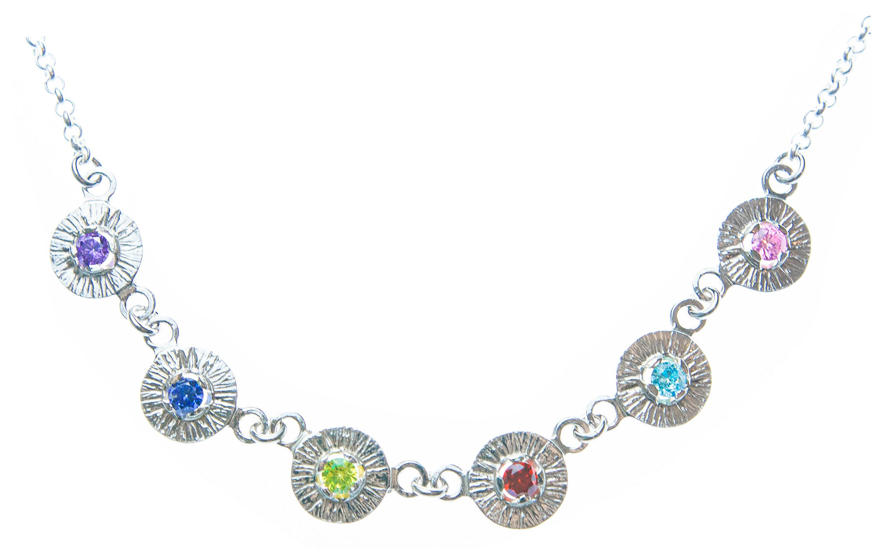 Me & Martina Säde H190-45 puolikääty on valmistettu hopeasta ja siinä on viisi korua, joissa moniväriset zirkonia-kivet. Säde -sarja on saanut inspiraationsa auringon ensimmäisistä säteistä kauniina talviaamuina. Valoa taittava pinta tekee korusta näyttävän ja tuo loistoa jokaiseen päivääsi. Materiaali: 925 Hopea, 4 mm Zirkonia. Ketjun pituus 45 cm. Yhden osan halkaisija 1 cm, kiven halkaisija 4 mm.