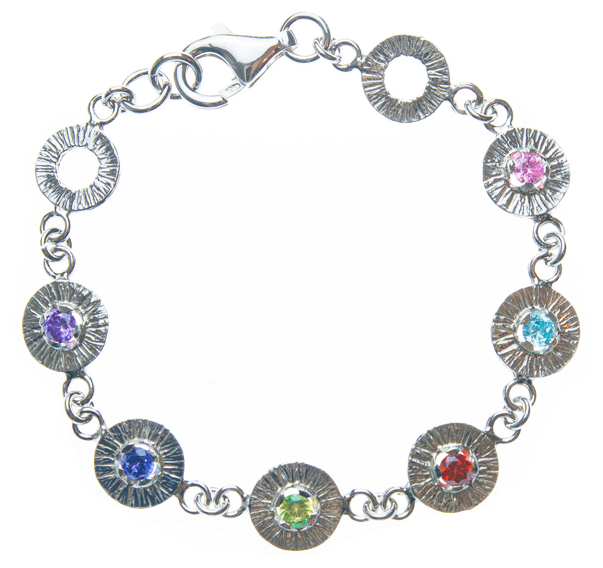 Me & Martina Säde multicolor H188-185 rannekorun kirkkaat moniväriset zirkonia-kivet tuovat väriä arkeen. Väreinä punainen, sininen, violetti, vihreä, vaaleanpunainen sekä vaaleansininen/turkoosi. Säde Sarja on saanut inspiraationsa auringon ensimmäisistä säteistä kauniina talviaamuina. Valoa taittava pinta tekee korusta näyttävän ja tuo loistoa jokaiseen päivääsi. Materiaali: 925 Hopea, moniväriset 4 mm Zirkoniat. Pituus noin 18,5 cm. Yhden osan halkaisija 1 cm, kiven koko 4 mm.