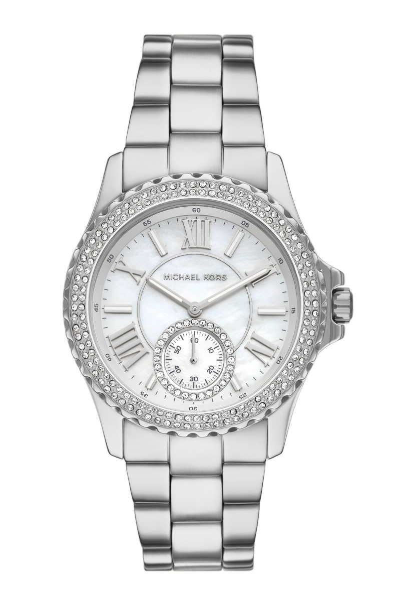 Michael Kors Everest stainless steel MK7403 naisten kello edustaa maksimaalista "more is more" trendiä. Tämä hyvin ylellinen ja ainutlaatuinen naistenkello on saanut ylleen helmiäiskellotaulun, ja kellotaulua sekä kehää koristaa useat kirkkaat briljanttihiotut zirkoniat. Kokonaisuus on näyttävä, ja kello on kuin koru ranteessasi. Michael Kors Everest stainless steel MK7403 toimitetaan omassa alkuperäispakkauksessaan 2 vuoden takuutodistuksen kera.