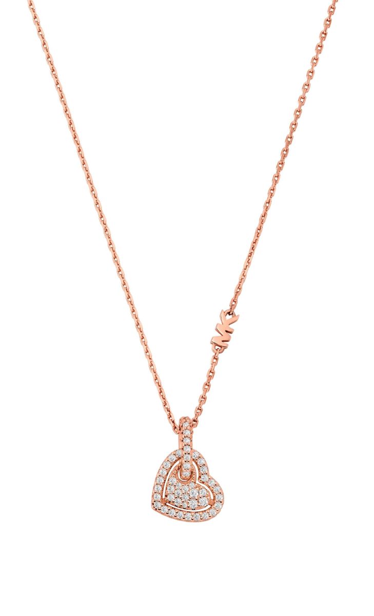 Michael Kors Love ruusukullanvärinen hopea sydänkaulakoru MKC1747CZ791 on ylellinen asuste huippusuunnittelija Michael Korsin valikoimasta. Sydänkaulakoru on 14-karaatin ruusukullattua sterling-hopeaa, ja riipusta koristaa pavè-istutus, jossa koko korun pinta on viimeistelty briljanttihiotuilla zirkonioilla. Sydänriipuksen koko on 12.5 mm, ja ketjun pituus on säädettävissä välille 45-50 cm. Michael Kors Love ruusukullanvärinen hopea sydänkaulakoru MKC1747CZ791 toimitetaan valmistajan alkuperäisessä rasiassa.