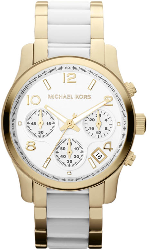 Rannekellon malli: Michael Kors Mid-Size Golden/White Acetate Runway Chronograph Watch