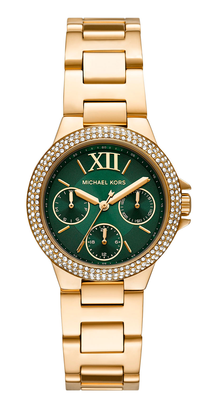 Michael Kors MK6981 Camille Gold on komea kullanvärinen naisten kello, jossa on ylellinen vihreä kellotaulu. Kellon kehys on koristeltu kristalleilla. Rungon leveys on 33 mm ja paksuus 9 mm. Kellotaulussa on kolme alataulua, jotka näyttävät 24 tunnin kellon, päivämäärän ja viikonpäivän. Kellotaulua suojaa mineraalilasi. Ranneke sopii ranteisiin, joiden ympärysmitta on 175 mm. Kello on vesitiivis 50 metriin saakka. Paristojen kesto 3 vuotta. Michael Kors -kelloilla on 2 vuoden takuu, ja ne lähetetään valmistajan alkuperäispakkauksessa.
