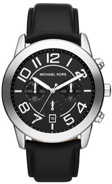 Tyylikäs Michael Kors MK8288 rannekello. Kellon runko on leveydeltään 45mm ja paksuudeltaan 13mm. Sen rannekkeen leveys on 22mm. Tuotteen nimi on kokonaisuudessaan Michael Kors MK8288 Mercer Silver-Tone Stainless Steel And Leather.