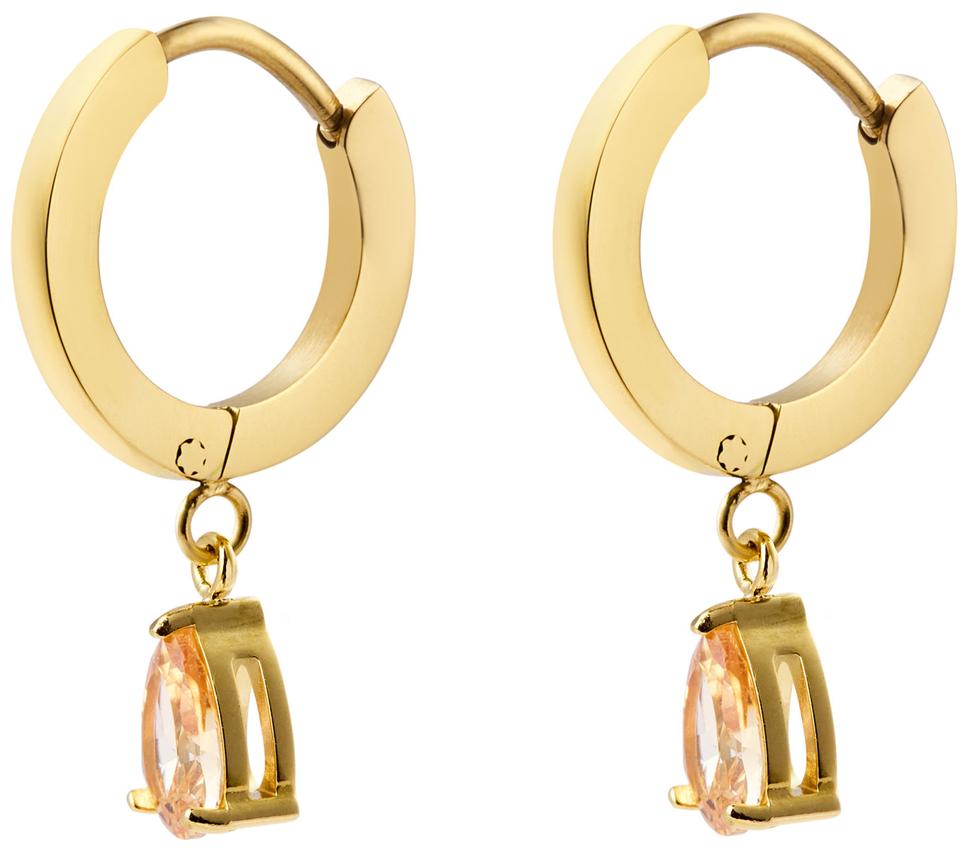 Mockberg Belle Gold Hoops Champagne MB0834 ovat klassiset 18K kullatut korvarenkaat PVD-pinnoitteella, jotka on valmistettu ruostumattomasta teräksestä. Korvakoruissa on näyttävät oranssin/beigen väriset ja pisaran muotoiset zirkoniat sekä ajattomat renkaat, jotka tekevät niistä täydellisen asusteen kaikkiin tilaisuuksiin. Koko: 13 mm.