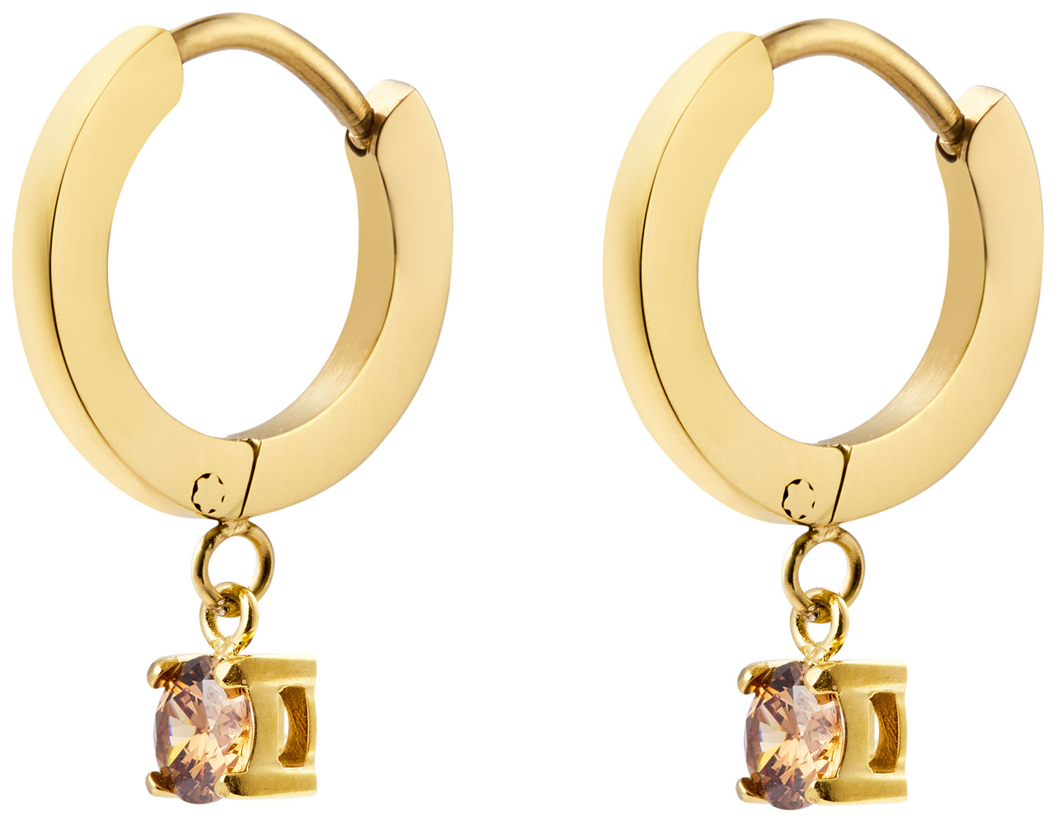 Mockberg Jolie Gold Hoops Coffee MB0823 ovat klassiset 18K kulta PVD-pinnoitteella varustetut korvarenkaat, jotka on valmistettu ruostumattomasta teräksestä. Korvakoruja koristaa näyttävät ruskeat zirkoniat ja ne ovat ihanteellisia jokapäiväiseen käyttöön. Koko: 13 mm.