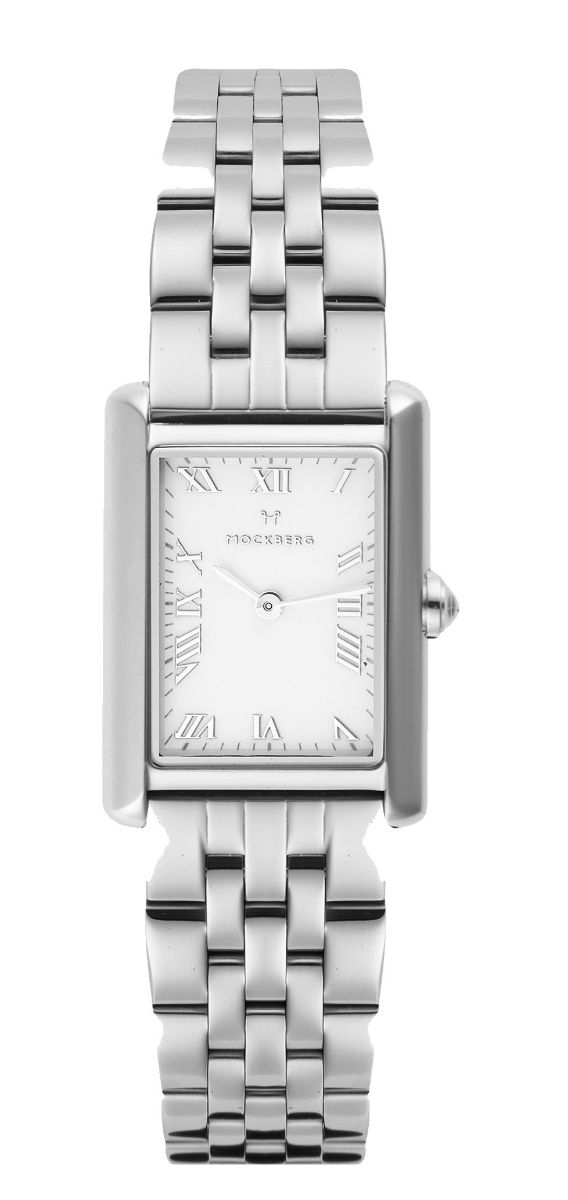 Nelikulmainen Mockberg Silver Grand Gold MO312 naisten rannekello huokuu ylellisyyttä. Tämä hopeanvärinen rannekello on valmistettu PVD-pinnoitetusta teräksestä, siinä on nelikulmainen runko ja teräsranneke, jonka pinta on hiottu puhtaan kiiltäväksi. Rungon koko on 23 x 31 mm, ja valkoista taulua suojaa mineraalilasi. Koneistona toimii Japanilainen Miyota GL22-koneisto. Kaikilla Mockberg-kelloilla on 2 vuoden vuoden takuu, ja ne toimitetaan FSC- sertifioidussa rasiassa.