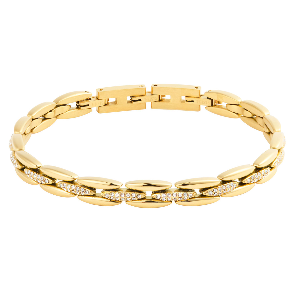 Mockberg x Kenza Illume on tyylikäs, teräksinen ketjurannekoru 18 karaatin kultaisella PVD-pinnoitteella, jonka toisiinsa kytkeytyvät palat sisältävät pavé-istutettuja valkoisia Preciosa-kiviä. Sen tarkkaan hiottu, kiiltävä pinta heijastaa valoa kauniisti ja luo huolitellun, mutta silti hillityn ilmeen. Säädettävä istuvuus ja pidennetty pituus takaavat käyttömukavuuden koko päiväksi. Käytä Illume-rannekorua yksinään korostaaksesi sen charmia tai yhdistä muiden rannekorujen kanssa näyttäväksi kerrokselliseksi kokonaisuudeksi.