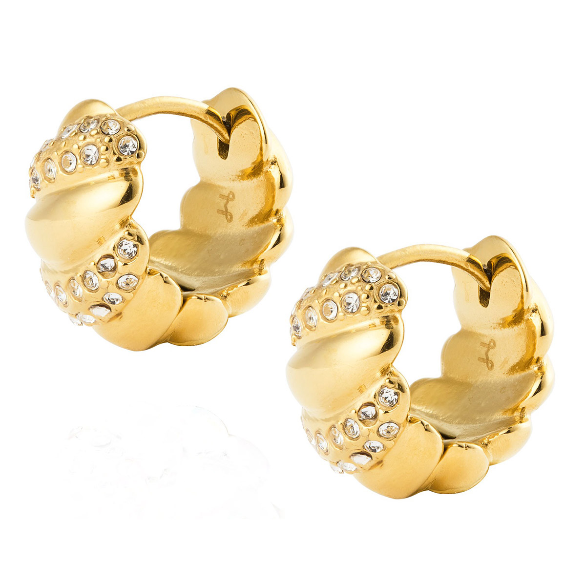 Mockberg x Kenza Noela MB1923 teräskorvakoruissa on pehmeästi kierretty muotoilu, jossa sileät osat kohtaavat pavé-istutetut kirkkaat Preciosa-kivet. 18 karaatin PVD kultapinnoitettujen Noela-korvakorujen kaareva muoto ja huolellisesti kiillotettu pinta luovat hienostuneen, rauhallisesti säihkyvän ilmeen, joka täydentää saumattomasti niin arkiset kuin juhlavammatkin kokonaisuudet. Koko: 19 mm.