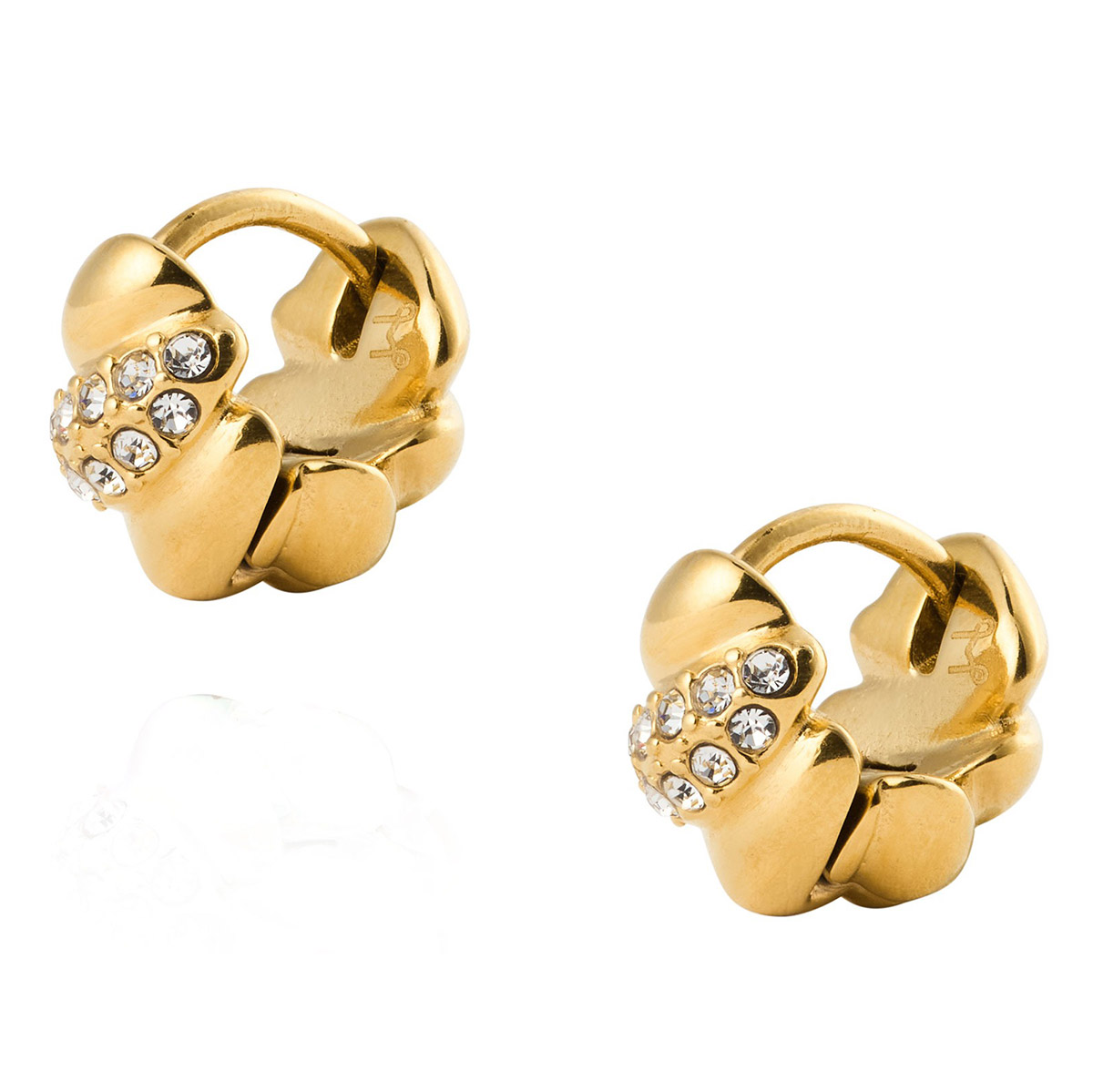 Mockberg x Kenza Noela MB1927 pienissä teräskorvakoruissa on pehmeästi kierretty muotoilu, jossa sileät osat kohtaavat pavé-istutetut kirkkaat Preciosa-kivet. 18 karaatin PVD kultapinnoitettujen Noela-korvakorujen kaareva muoto ja huolellisesti kiillotettu pinta luovat hienostuneen, rauhallisesti säihkyvän ilmeen, joka täydentää saumattomasti niin arkiset kuin juhlavammatkin kokonaisuudet. Koko: 13 mm.