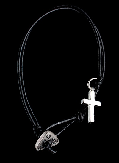NB Collection Tube rannekoru. Rannekoru on valmistettu hopeasta ja nahkasta, sen pituus on 17,5cm. Nauhassa oleva risti on hopeaa ja sen korkeus lenkin kanssa on 2,5cm. Kaikki NB Collection korut toimitetaan valmistajan alkuperäisessä rasiassa.