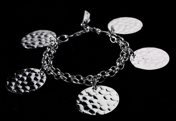 NB Collection DISK rannekoru. Rannekoru on valmistettu hopeasta ja rannekorun pituus on säädettävissä 18,5cm tai 21cm. Korun ketju on kaksinkertainen ja sitä koristaa viisi pyöreää riipusta, riipuksien halkaisija on 2,4cm. Kaikki NB Collection korut toimitetaan valmistajan alkuperäisessä rasiassa.