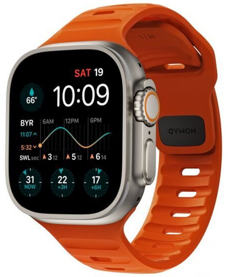 Nomad Sport Strap Orange 42/44/45/49 mm NM00736685 on oranssi ranneke, joka on valmistettu fluoroelastomeerista. Materiaalina fluoroelastomeeri on kevyt, joustava ja erittäin kestävä eli se kestää kovempaakin jokapäiväistä käyttöä. Kiinnitys tapahtuu asettamalla alumiininen pinni rannekkeen kiinnitysreiän läpi. Tällöin rannekkeen häntä asettuu kätevästi kättä vasten, eikä jää irvistämään. Päivitä Apple Watchiisi uusi ilme helposti Nomad Sport Strap NM00736685 -rannekkeen avulla!