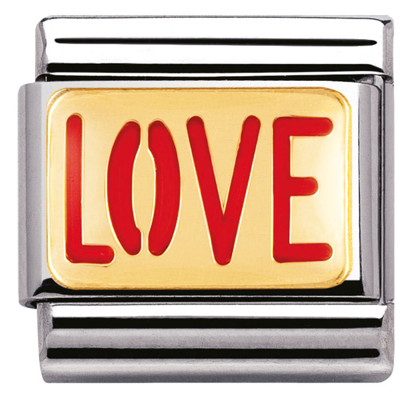 Nomination 030229-12, Love. Nomination palat ovat valmistettu laadukkaasta ruostumattomasta teräksestä ja 18k kullasta. Palojen värikäät kohdat ovat emalia. Nomination paloille myönnetään kahden vuoden takuu ja ne toimitetaan valmistajan omassa rasiassa.