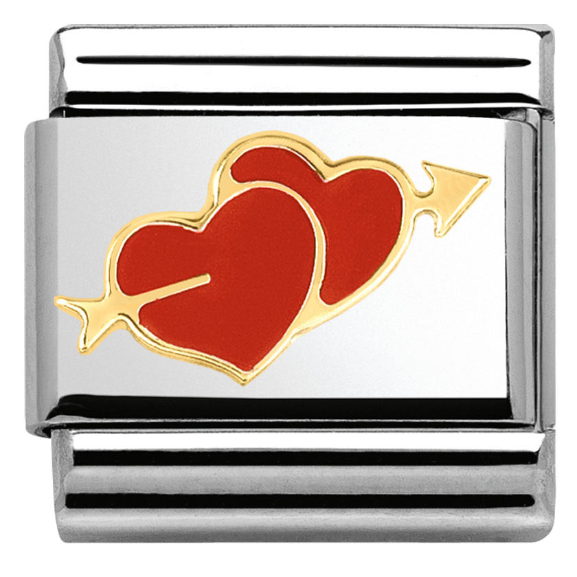 Nomination 030253-25, emaloidut sydämet. Nomination palat ovat valmistettu laadukkaasta ruostumattomasta teräksestä ja 18k kullasta. Palojen värikkäät kohdat ovat emalia. Nomination paloille myönnetään kahden vuoden takuu ja ne toimitetaan valmistajan omassa rasiassa.