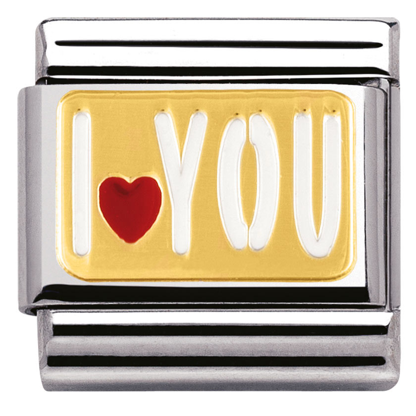 Nomination 030261-27, I Love You. Nomination palat ovat valmistettu laadukkaasta ruostumattomasta teräksestä ja 18k kullasta. Palojen värikäät kohdat ovat emalia. Nomination paloille myönnetään kahden vuoden takuu ja ne toimitetaan valmistajan omassa rasiassa.