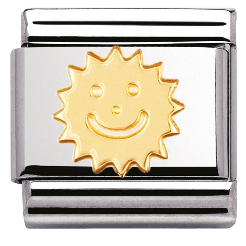 Nomination aurinko 030110-02. Nomination palat ovat valmistettu laadukkaasta ruostumattomasta teräksestä ja 18k kullasta. Nomination paloille myönnetään kahden vuoden takuu ja ne toimitetaan valmistajan omassa rasiassa.
