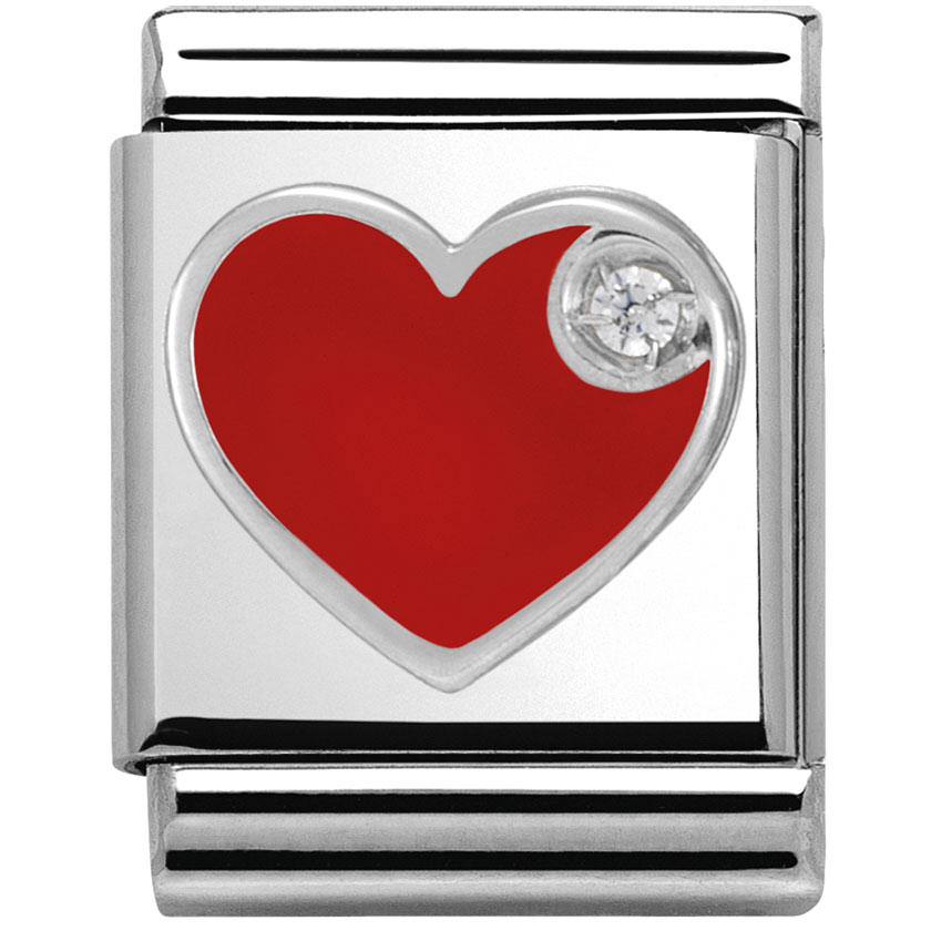 Nomination 332305-07 Big sydän pala kivellä on valmistettu laadukkaasta ruostumattomasta teräksestä ja 925- sterling hopeasta. Palan värikkäät osat ovat emalia ja siihen on istutettu kirkas Zirconia korukivi. Nomination paloille myönnetään kahden vuoden takuu, ja ne toimitetaan postikuluitta!