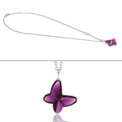 Nomination Butterfly kaulakoru 021370/001. Kaulakoru on valmistettu ruostumattomasta teräksestä ja sen pituus on 42cm/44cm (säädettävä). Riipuksessa Swarovskin violetti kristalli. Kristalliperhosen leveys 20mm. Toimitetaan valmistajan alkuperäisessä rasiassa postikuluitta!