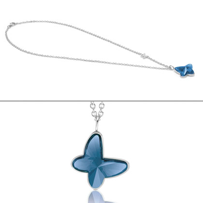Nomination Butterfly kaulakoru 021370/007. Kaulakoru on valmistettu ruostumattomasta teräksestä ja sen pituus on 42cm/44cm (säädettävä). Kristalliperhosen leveys 20mm. Riipuksessa Swarovskin sininen kristalli. Toimitetaan valmistajan alkuperäisessä rasiassa postikuluitta!