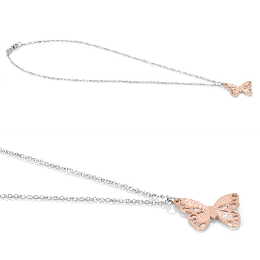 Kaunis Nomination Butterfly kaulakoru 021378/011. Kaulakoru on valmistettu ruostumattomasta teräksestä ja sen pituus on säädettävissä 42 tai 44cm pituiseksi. Punakullan väriseksi pinnoitetun perhosen siipeen on istutettu kirkas synteettinen Zirconia korukivi. Toimitetaan valmistajan alkuperäisessä rasiassa postikuluitta!
