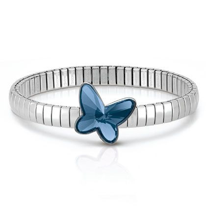 Nomination Butterfly rannekoru 021365/007. Rannekoru on valmistettu ruostumattomasta teräksestä. Rannekoru on yhden koon malli ja venyy tarvittavaan mittaan. Rannekorussa Swarovskin sininen kristalli. Kristalli perhosen leveys 20mm. Toimitetaan valmistajan alkuperäisessä rasiassa postikuluitta!