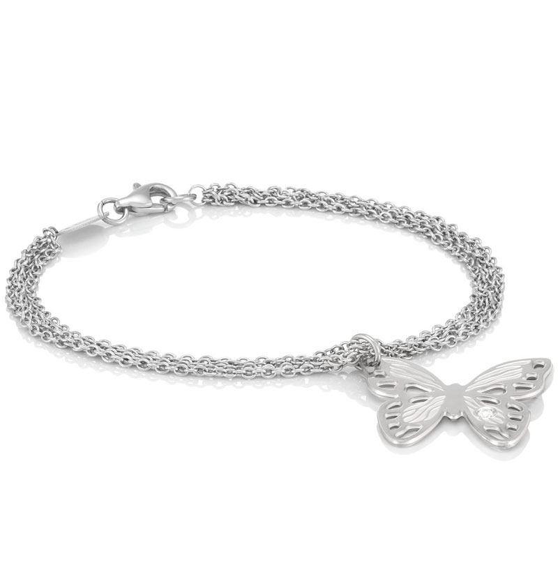 Kaunis Nomination Butterfly rannekoru 021377/001. Rannekoru on valmistettu ruostumattomasta teräksestä ja sen pituus on 19cm. Perhosen siipeen on istutettu kirkas synteettinen Zirconia korukivi. Toimitetaan valmistajan alkuperäisessä rasiassa postikuluitta!