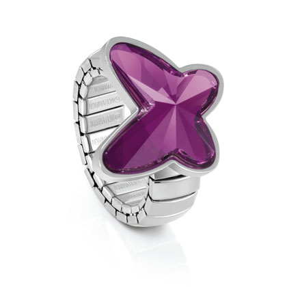 Nomination butterfly sormus 021362/001. Sormus on valmistettu ruostumattomasta teräksestä. Sormus on yhden koon malli ja venyy tarvittavaan mittaan. Sormuksessa Swarovskin viloetti kristalli. Kristalliperhosen leveys 20mm. Toimitetaan valmistajan alkuperäisessä rasiassa postikuluitta!