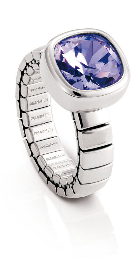 Nomination Chic sormus 043000/001. Sormus on valmistettu ruostumattomasta teräksestä. Sormus on yhden koon malli ja venyy tarvittavaan mittaan. Sormuksessa Swarovskin violetti kristalli. Toimitetaan valmistajan alkuperäisessä rasiassa postikuluitta!